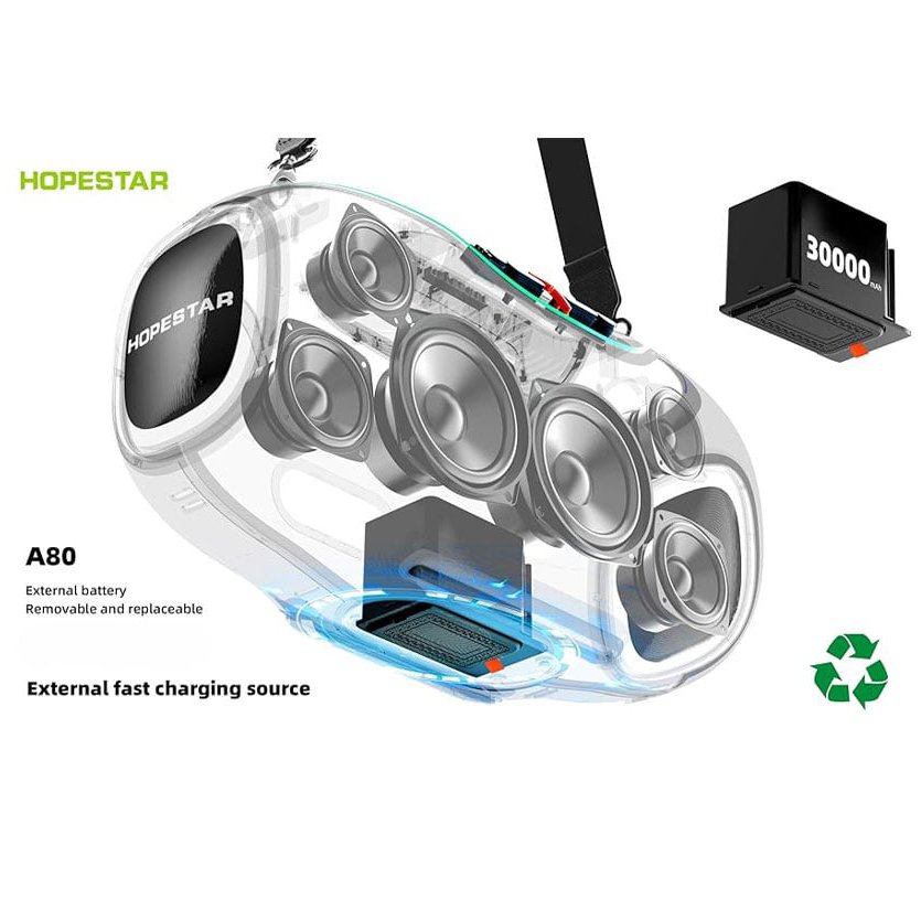 اسپیکر هوپ استار A80B مجهز به تکنولوژی TWS، رقص نور، میکروفون وایرلس، دسته قابل حمل، باتری 30000 میلی آمپر، توان خروجی 350 وات و درگاه های ورودی متنوع می باشد.