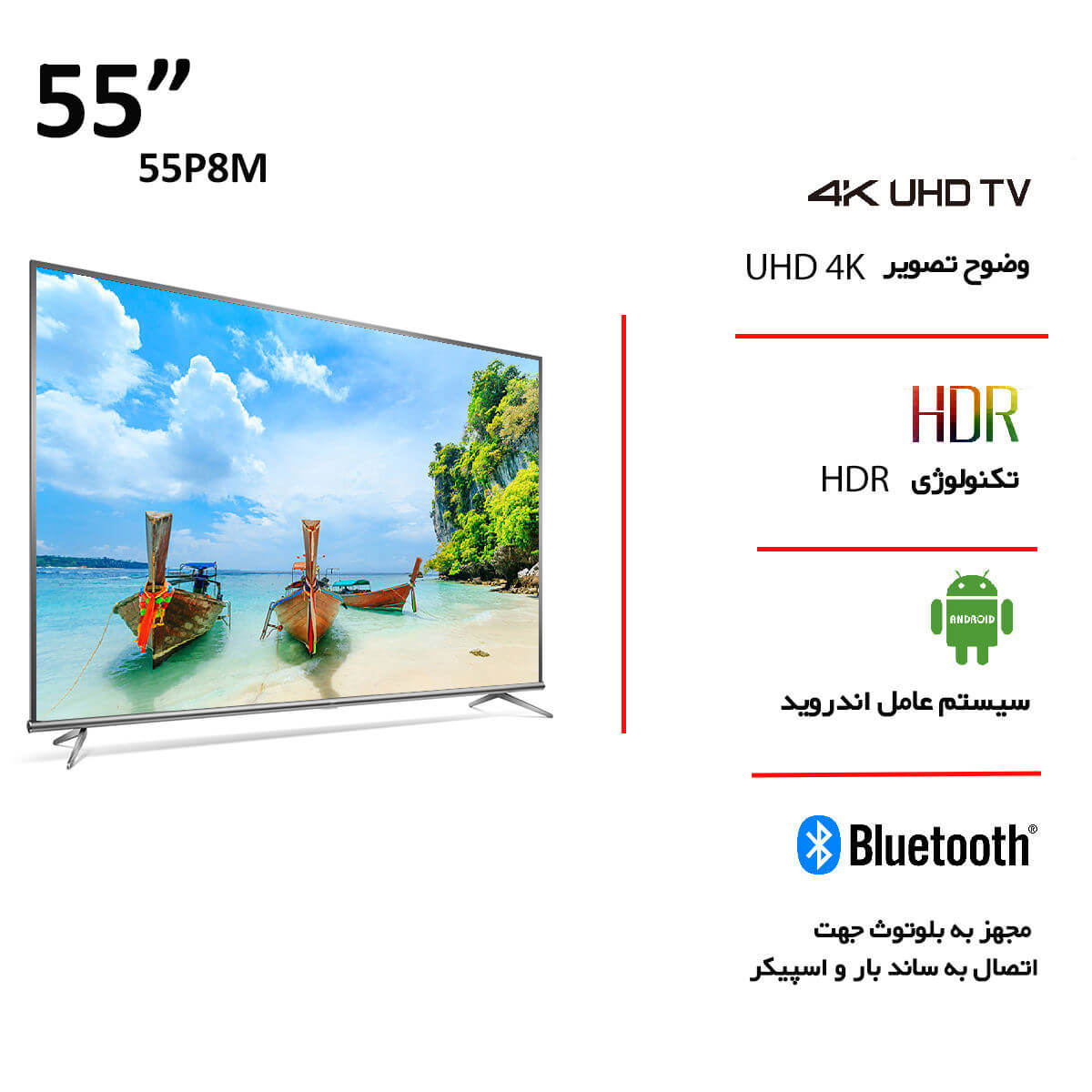 ال ای دی تی سی ال 55P8M که جز تلویزیون های هوشمند برند تی سی ال است دارای کیفیت تصویر ULTRA HD 4K با رزولوشن 38402160 x میباشد و مجهز به فناوری USB) HDR10) است .