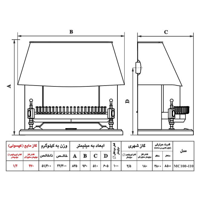 بخاری گازی شومینه ای نیک کالا MC110 مدل قوسی مدرن