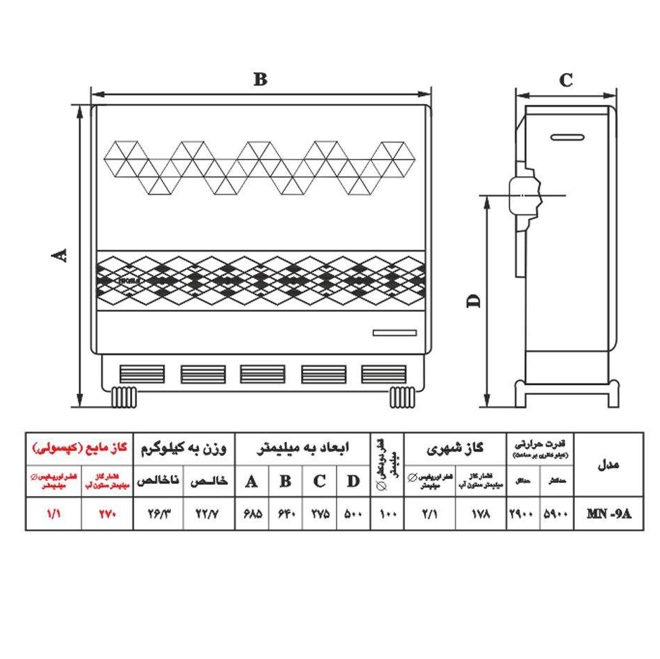 دارای جرقه زن – شیشه ایمن – قابلیت تنظیم دما – قابلیت نصب بر روی زمین – کم مصرف – مجهز به سیستم ایمنی ODS – قطع خودکار گاز در صورت کاهش 18 درصدی اکسیژن |