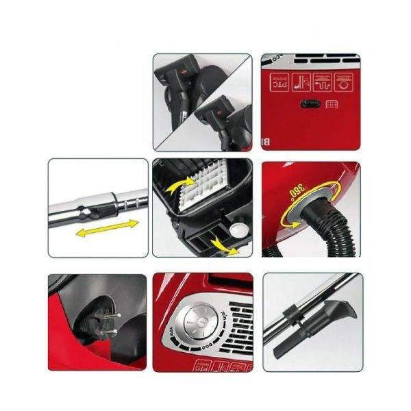 لوله تلسکوپی فلزی آبکاری شده – گردش 360 درجه کوپلینگ (لوله خرطومی) – پایه جهت نصب برس مبل و گوشه پاک کن – سیستم پارک لوله تلسکوپی در دو وضعیت (ایستاده و خوابیده) – فیلترهای هوای ورودی و خروجی – قابلیت تنظیم میزان مکش – دارای محافظ حرارتی موتور در هنگام کارکردهای طولانی – مجهز به میکروفیلتر ورودی قبل از موتور و فیلتر اسفنجی در خروجی موتور – محافظ فشاری موتور در هنگام پر شدن پاکت جارو برقی یا گرفتگی لوله – نشان استاندارد ملی ایران (ایمنی) – عایق کاری دوبل قطعات الکتریکی جهت ایمنی بیشتر محصول – سیم جمع کن خودکار – قابلیت استفاده از کیسه کاغذی |