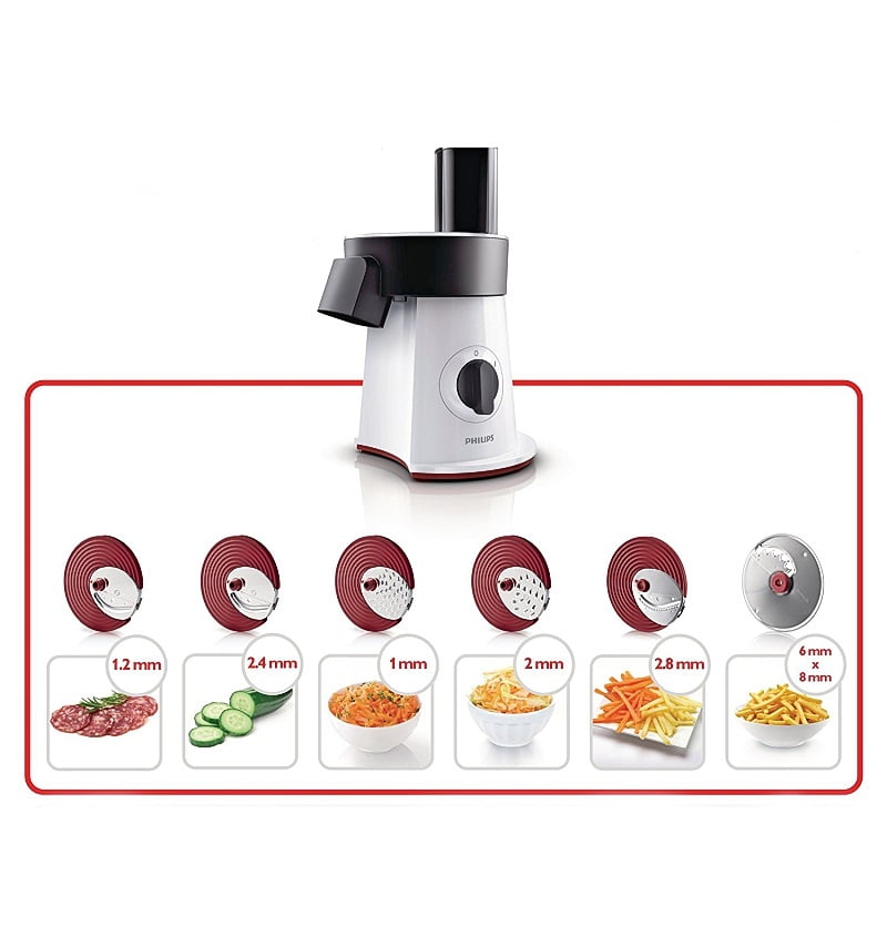 دارای 6 دیسک استیل ضد زنگ برای ورقه کردن، رنده کردن و خلال کردن سبزیجات – دارای دهانه عریض – قابل استفاده برای انواع سبزیجات، پنیر، سیب زمینی و گوشت – قابلیت شستشوی اجزا (به جز بدنه اصلی) در ماشین ظرفشویی – محل نگهداری کابل برق – دارای سیستم ایمنی