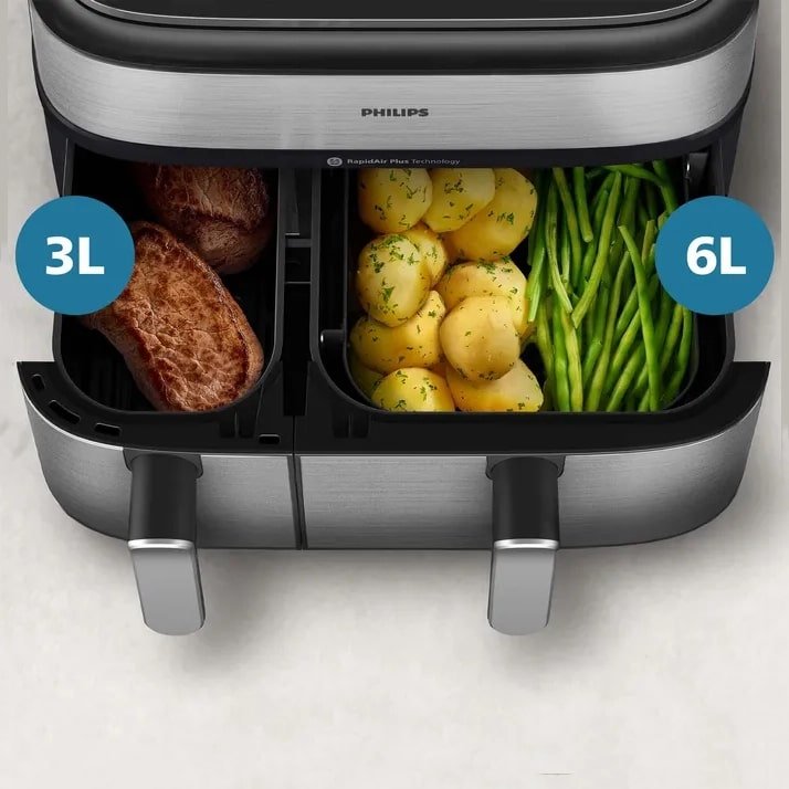 سرخ کن کم روغن و بدون روغن 7 نفره – دارای 2 سبد 6 و 3 لیتر – قابلیت پخت با بخار برای بافت لطیف تر – 12 برنامه پخت خودکار – تکنولوژی Rapid Air – سبد و سینی نچسب تفلون – امکان نظافت دستگاه با بخار – حالت گرم کردن مجدد با کمک بخار – قابلیت گرم نگهدارنده – قابلیت تنظیم دما از 40 تا 200 درجه سانتی گراد – سبد کشویی – کاسه مربع شکل – دستگیره خنک – بدنه عایق سرد – قابلیت شستشوی قطعات در ماشین ظرفشویی – بدنه استیل و پلاستیک – کابل برق 80 سانتی متری – کانوکشن – خاموش / روشن – دکمه های سوئیچ روی سبد بزرگ و کوچک – دکمه بازگشت – دکمه همسان سازی تنظیمات دو سبد – دما و زمان – یادآور تکان داد سبد – انتخاب برنامه پخت – پایه لاستیکی برای ثبات بیشتر دستگاه |