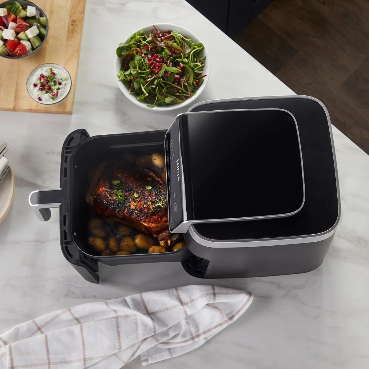 سرخ کن نینجا مدل AF180 دارای یک کاسه مربع شکل با جنس روکش نچسب است که به صورت کشویی باز می شود و با ظرفیت 6.2 لیتر امکان پخت سیب زمینی، گوشت، مرغ، ماهی، سبزیجات، اسنک، پیتزا، دسر، همبرگر، میگو و … را فراهم می کند. همچنین قابلیت پخت 1.4 کیلوگرم سیب زمینی سرخ شده یا بال مرغ به صورت همزمان در این سرخ کن وجود دارد و دستگاه را برای یک خانواده 4 نفره ایده آل کرده است.