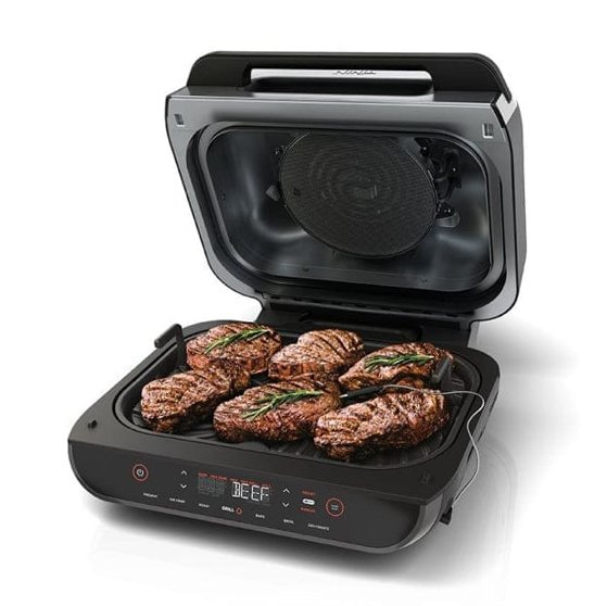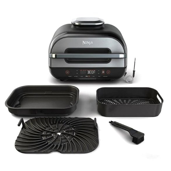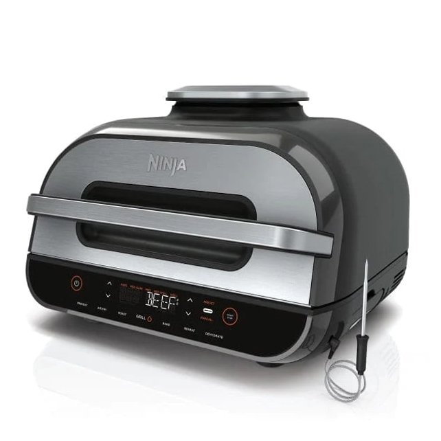 سرخ کن و گریل نینجا AG551 با توان 2460w، ظرفیت 3.8lit، نمایشگر لمسی، کانوکشن، 5 سطح گریل، پروب هوشمند و قابلیت تنظیم دما، قابلیت استفاده بدون روغن را دارد.