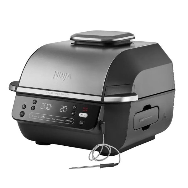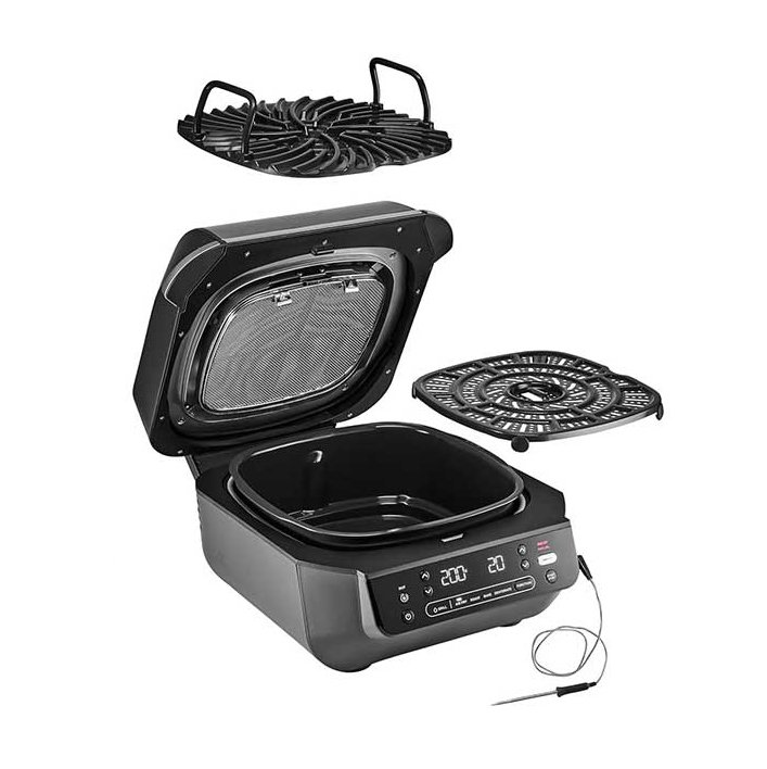سرخ کن و گریل نینجا EG351 با نمایشگر LCD، ظرفیت 5.7 لیتر، توان 1760 وات، دماسنج هوشمند، کانوکشن و تایمر به قابلیت خشک کردن، گریل، پختن و کباب کردن مجهز است.
