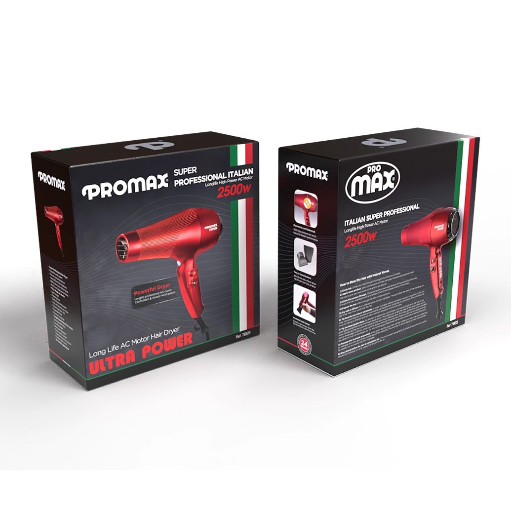 سشوار پرومکس 7865 به کابل برق 3 متری، موتور AC با توان 2500 وات، 3 حالت دما، کنترل دو سرعته، 2 متمرکز کننده هوا، المنت سرامیکی و حلقه آویز مجهز می باشد.
