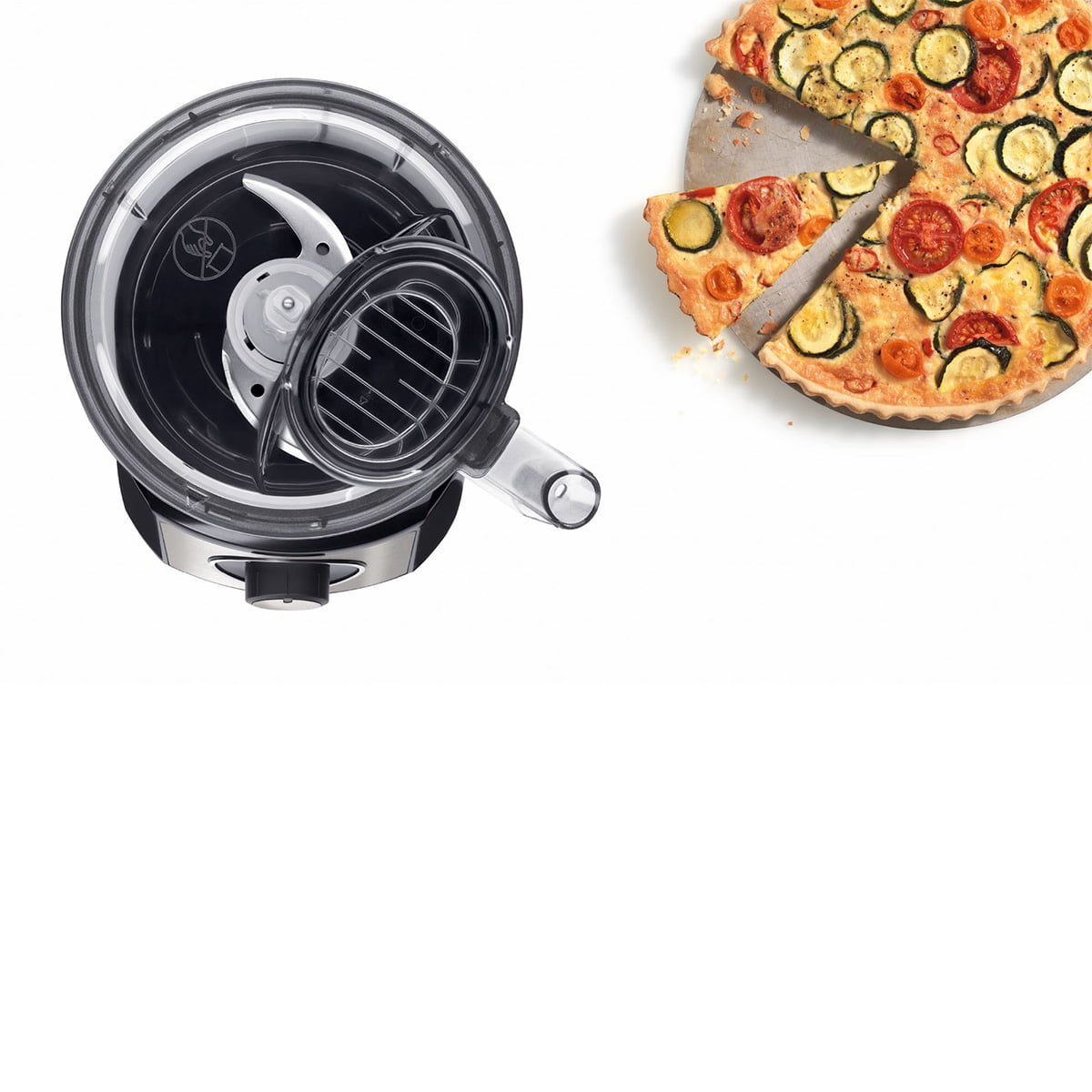 در بالای بدنه ی اصلی، ظرف خردکن متصل میشود تا با اتصال تیغه ها و دیسک های رنده ی مختلف، عملکردهای متفاوتی مثل ریزکردن، خردکردن، رنده در اشکال مختلف و حتی قابلیت خمیرزن در دستگاه مشاهده شود.