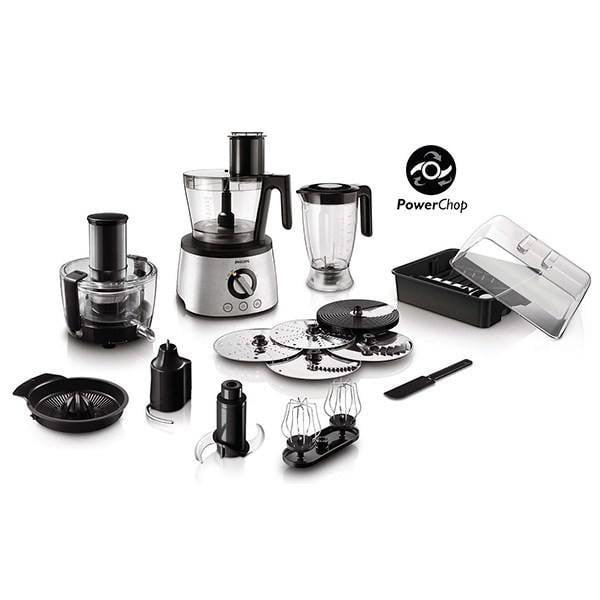 مجهز به فن‌آوری PowerChop که امکان خرد کردن مواد نرم و سخت را فراهم می سازد.- کلیدهای از پیش تنظیم شده برای عملکرد خاص; خردکردن یخ، زدن خمیر و همزدن کرم – همزن دو قلو با کارایی بیشتر- دارای یک عدد دیسک چیپس ساز که از 1 تا 7 میلی متر قابل تنظیم است.- آبمیوه گیری با دهانه بسیار عریض -میزان صدا: 86 دسی بل