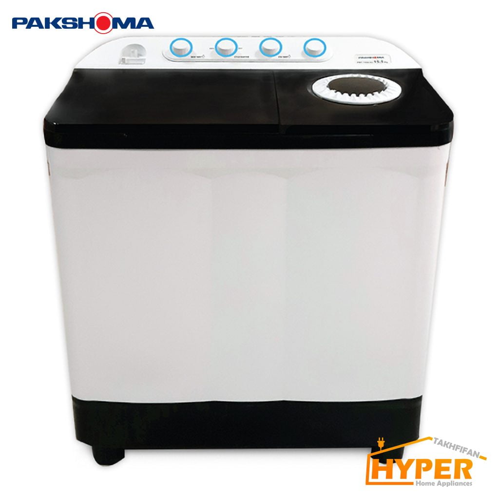 لباسشویی دوقلو پاکشوما PWF-1564AJ با بدنه پلاستیک به رنگ سفید، دارای دو مخزن و دو درب مجزا که جهت باز شدن درب ها به سمت بالا می باشد. همچنین با ابعاد 55 × 97 × 101 cm و ظرفیت 15.5 کیلوگرمی توسط شرکت داخلی پاکشوما طراحی و روانه بازار شده است.بطور کلی دارای 3 برنامه شستشو می باشد.