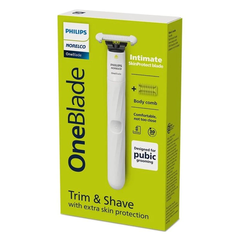 قابل استفاده به صورت خشک و مرطوب – فناوری OneBlade Intimate – کابل USB A – ولتاژ 5 ولت – توان مصرفی 0.25 وات – سیستم Contour following – تیغه SkinProtect – سیستم محافظت سه گانه – شانه بدن 3 میلی متر – تیغه دو طرفه Dual sides Blades – باتری نیکل هیدرید فلز Ni-MH