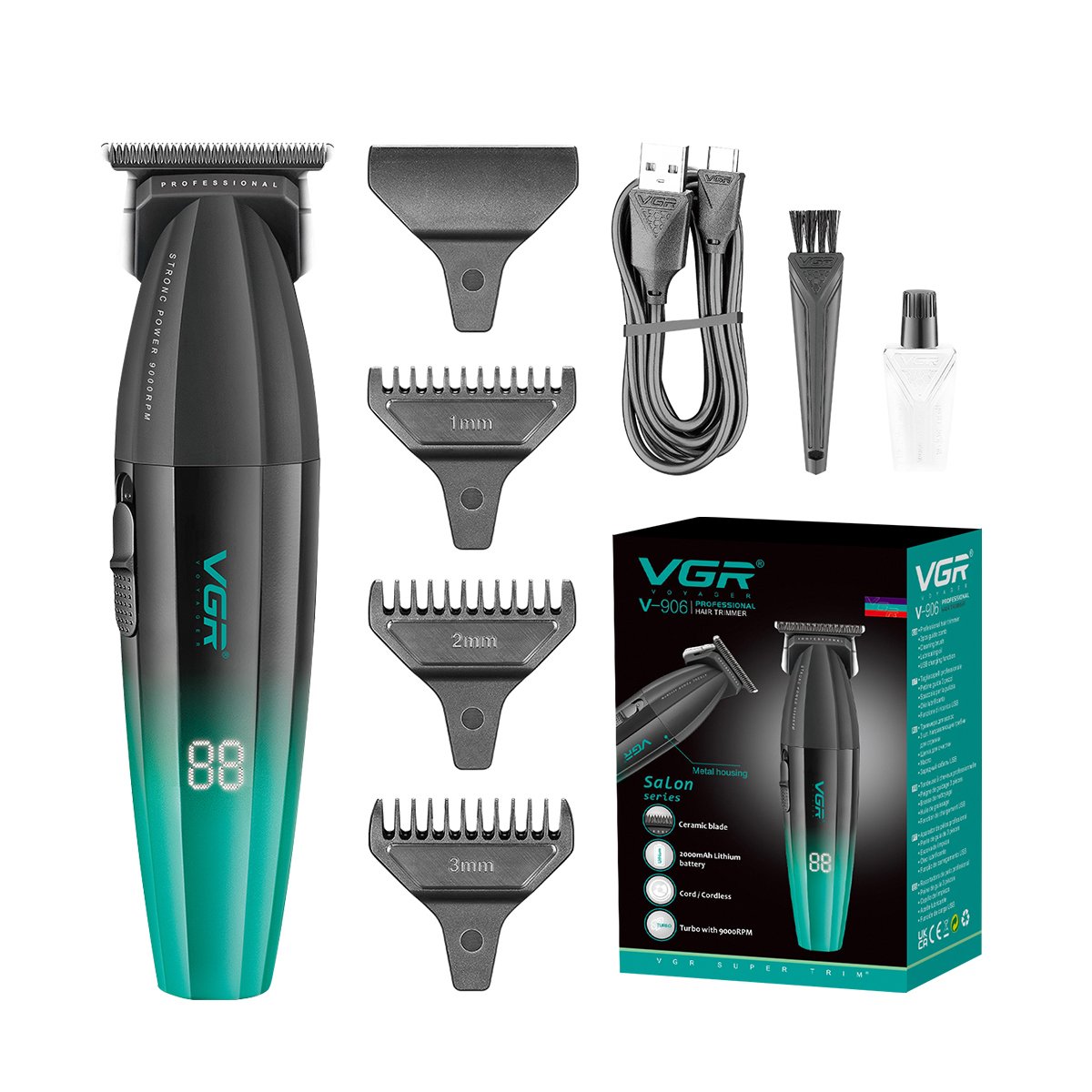 ماشین اصلاح وی جی آر VGR V-906 مجهز به باتری قدرتمند لیتیوم یون با ظرفیت 2000 میلی آمپر ساعت، خط زن، حالت توربو، 3 عدد شانه مختلف و نمایشگر LED می باشد.