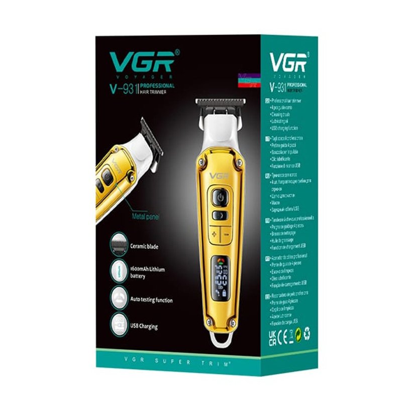 ماشین اصلاح وی جی آر VGR V-931 دارای کارکرد بی سیم و باسیم، باتری Li-Ion قابل شارژ 1600mah، نمایشگر LED، خط زن، سرعت موتور 7000rpm و تکنولوژی برش مستقیم است.