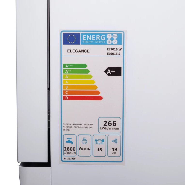 ماشین ظرفشویی الگانس EL9016W با ظرفیت 15 نفره، دارای برنامه تعویق شستشو و شستشوی سریع، 7 برنامه، نمایشگر LED، غیب یاب، 3 آبفشان، انرژی ++A و خشک کن اضافی است.