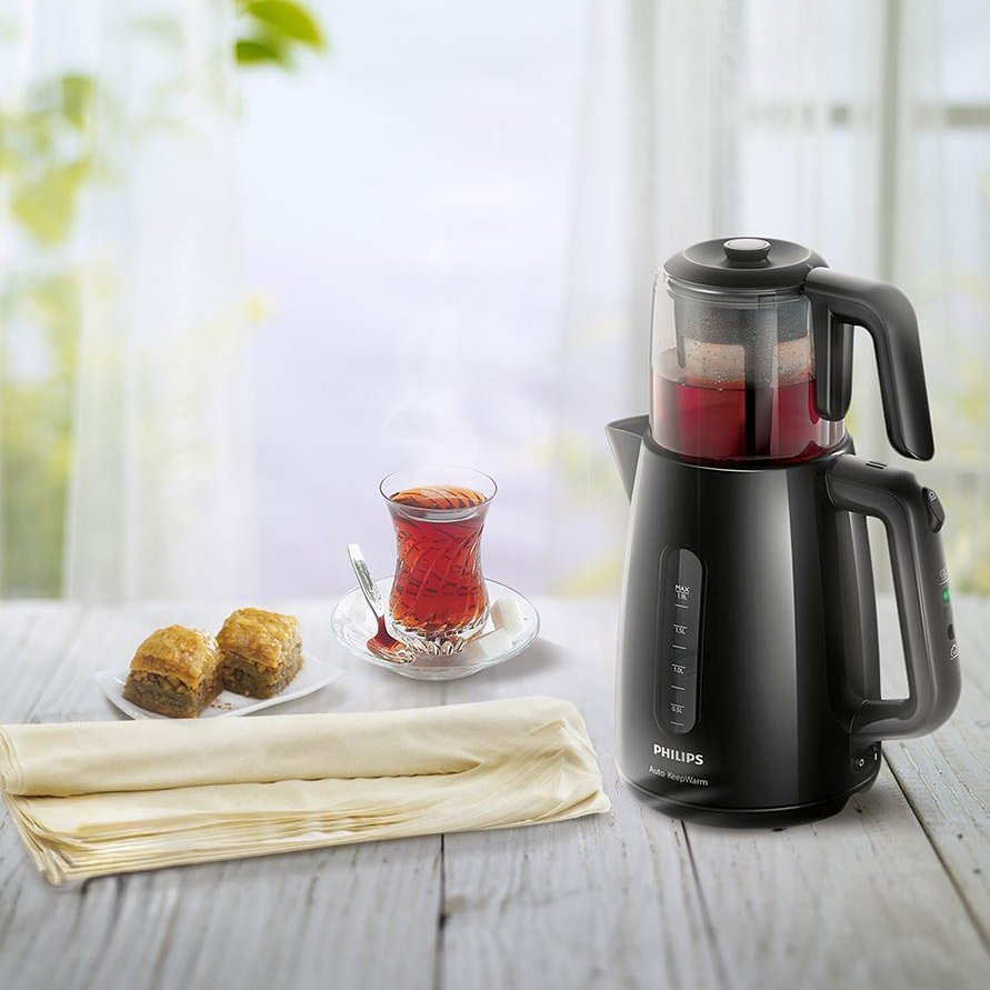 چای ساز فیلیپس مدل HD7301 گرمای مورد نظر خود را از طریق المنت مخفی که در زیر کتری قرار می گیرد، تامین می کند و با وجود کتری 1.9 لیتری و قوری 0.9 لیتری برای خانواده های متوسط ایده آل می باشد. کفی داخلی کتری نیز از جنس استیل ضد زنگ است و از آنجایی که دهانه بزرگ کتری به صورت 90 درجه باز میشود، عملکرد تمیز کردن آسان را برای کاربر فراهم می آورد. نشانگر آب روی بدنه کتری به راحتی میزان سطح آب را نشان می دهد و کاربر می تواند بدون نیاز به باز کردن درب دستگاه، آب داخل آن را کنترل نماید.