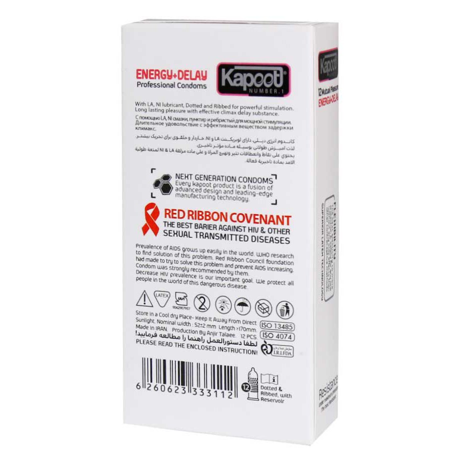 در بعد فیزیکی، کاندوم کاپوت انرژی Energy Delay با طراحی خاردار و حلقوی سطح خود، تحریک هدفمندی را برای بانوان به ارمغان می آورد. این برجستگی های و شیارهای ظریف، نقاط حساس را درگیر کرده و سرعت دستیابی به اوج لذت را برای شریک جنسی زنانه افزایش می دهند. برای تضمین طولانی تر شدن رابطه و هماهنگی با تحریک ایجاد شده، این کاندوم حاوی ماده موثره تأخیری (مانند بنزوکائین/لیدوکائین) با دوز ملایم و استاندارد است.