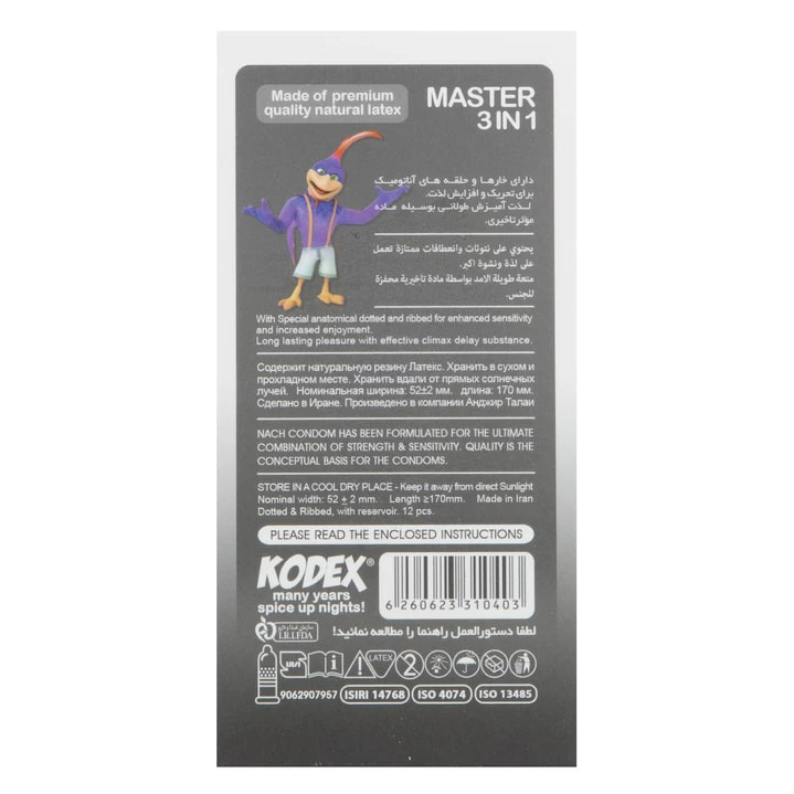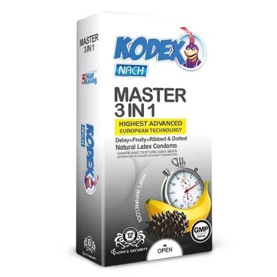 کاندوم تاخیری کدکس مستر 3 در 1 تأخیر انزال، خارهای تحریک کننده و روان کننده قوی. افزایش زمان و کیفیت رابطه برای ارگاسم همزمان زوجین.