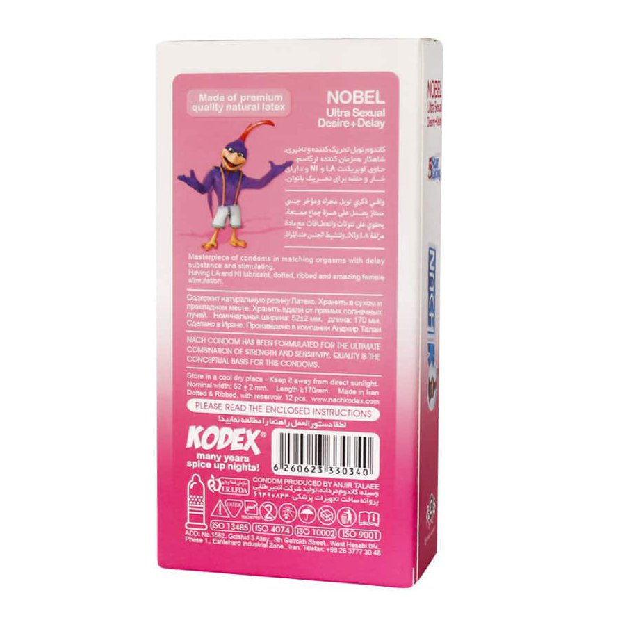 کاندوم تاخیری کدکس نوبل Nobel شاهکار تاخیر و لذت. حاوی بنزوکائین برای رفع زود انزالی و دارای خار و حلقه برای تحریک و ارگاسم همزمان.
