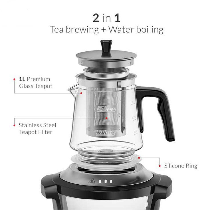 چای ساز فلر TS390 مجهز به کتری 3 لیتری و قوری شیشه ای 1 لیتری، سیستم قطع کن خودکار، نشانگر سطح آب، نشانگر LED و صافی توری و فیلتر استیل ضد زنگ می باشد.