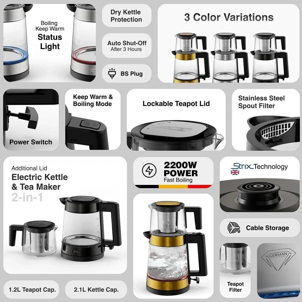 کتری چای ساز 2200 وات فلر مدل TS600 با ظرفیت 2 لیتر و کف استیل ضد زنگ ساخته شده که مقاومت بالایی در برابر حرارت داشته و نظافت آن بسیار آسان است. وجود المنت حرارتی مخفی علاوه بر افزایش طول عمر دستگاه، از ایجاد رسوب و لک جلوگیری می کند و زیبایی ظاهری آن را حفظ می نماید. قوری این مدل از جنس شیشه با ظرفیت 1.2 لیتر است که امکان مشاهده میزان دم کشیدن چای را فراهم می کند. فیلتر داخل قوری نیز قابل شستشو بوده و مانع ورود تفاله به چای می شود.