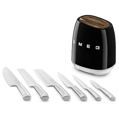 سرویس چاقو 7 پارچه اسمگ KBSF01BL مشکی از محصولات با کیفیت و زیبای برند اسمگ Smeg در دسته لوازم آشپزخانه است که با رنگ مشکی و طراحی منحصر به فرد رترو ایتالیایی خود جلوه خاصی به فضای آشپزخانه بخشیده و مورد استقبال همه قرار گرفته است. سرویس چاقو 7 پارچه اسمگ KBSF01BL مانند دیگر محصولات این برند اصالت و نوآوری را به نمایش گذاشته و با قیمتی اقتصادی نسبت به کیفیت بالای خود، در اختیار خریداران قرار گرفته است.
